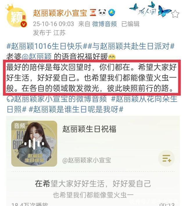 “颖火虫”漫天的爱意和行动,赵丽颖都看得见!嘿嘿嘿在赵丽颖生日当天,“颖火虫”们也收到了来自颖宝的语音祝福!